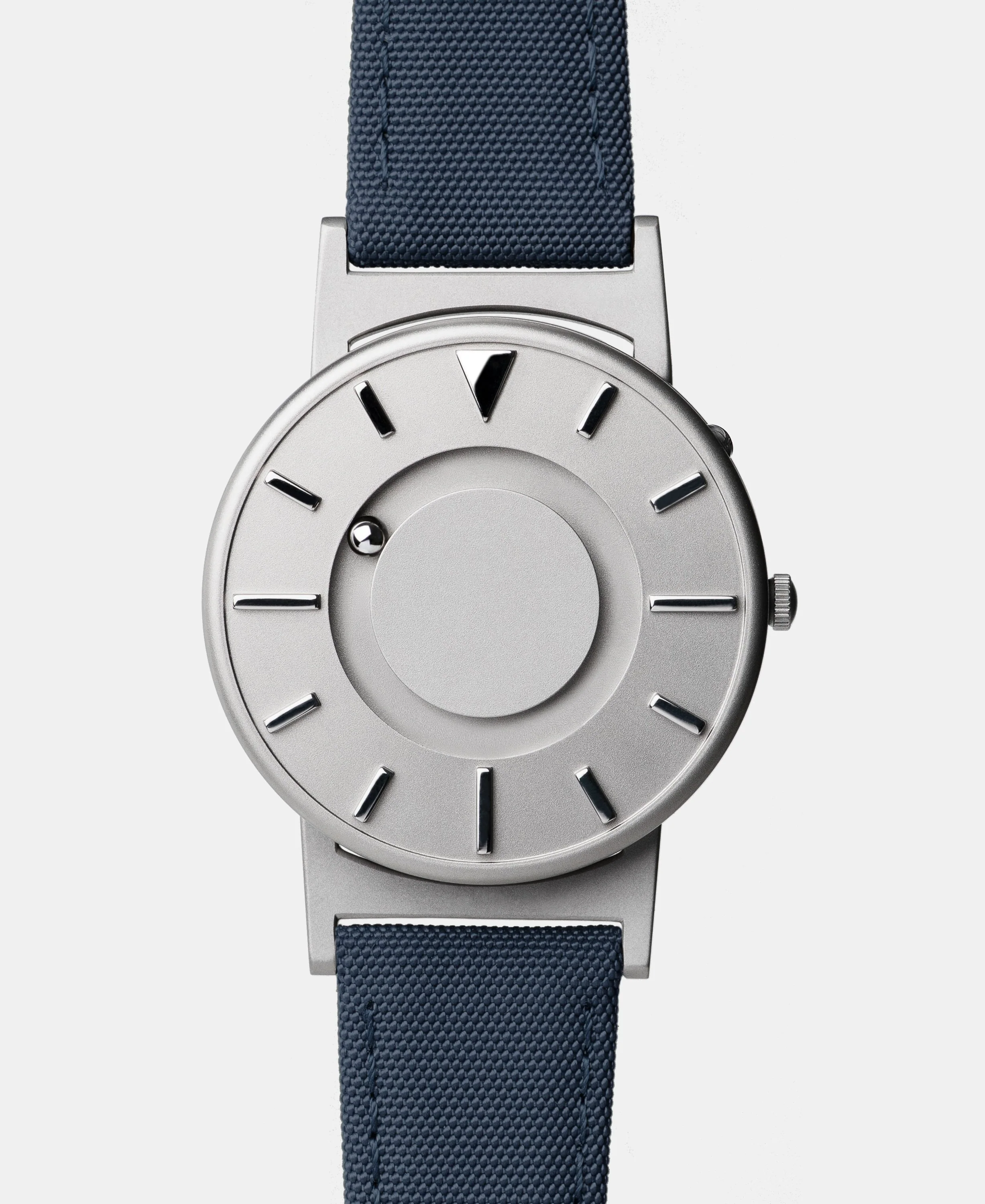 The Bradley timepiece features raised markers that allow you to feel the time by touch: a triangular marker for twelve, elongated line segments for three, six, and nine, and shorter line segments for the other markers. Two magnetized ball bearings travel around the watch face in separate, recessed tracks: one track around the center of the watch face for the minute, and one track around the outside edge of the watch face for the hour.