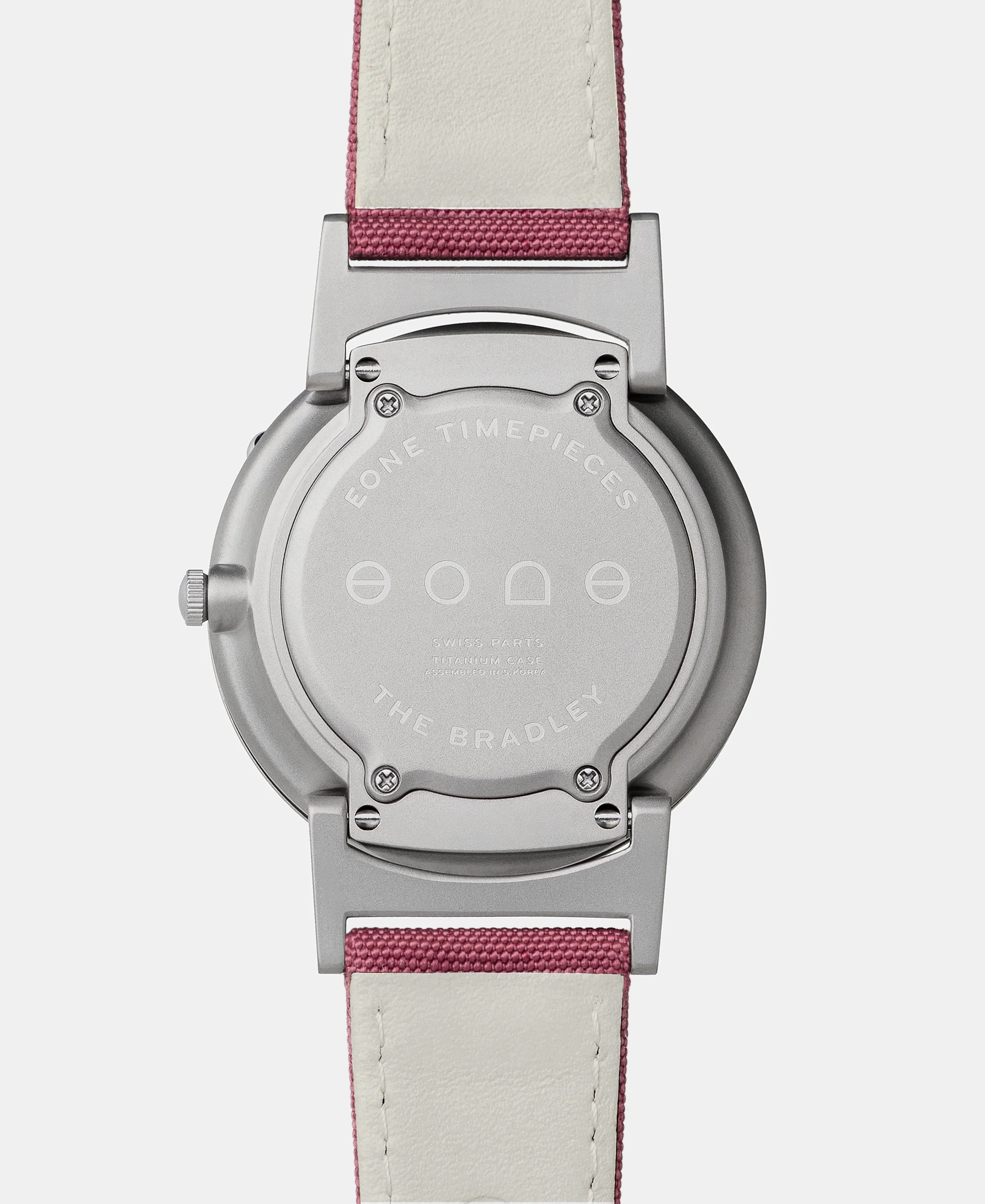 Crafted from lightweight and durable matte silver titanium, the Bradley Canvas features raised markers brushed in a smooth mirrored finish. The dyed canvas strap with ivory Italian leather reverse is available in six colors. Choose from crimson (red), olive (green), aqua (blue), noir (black), or beige.