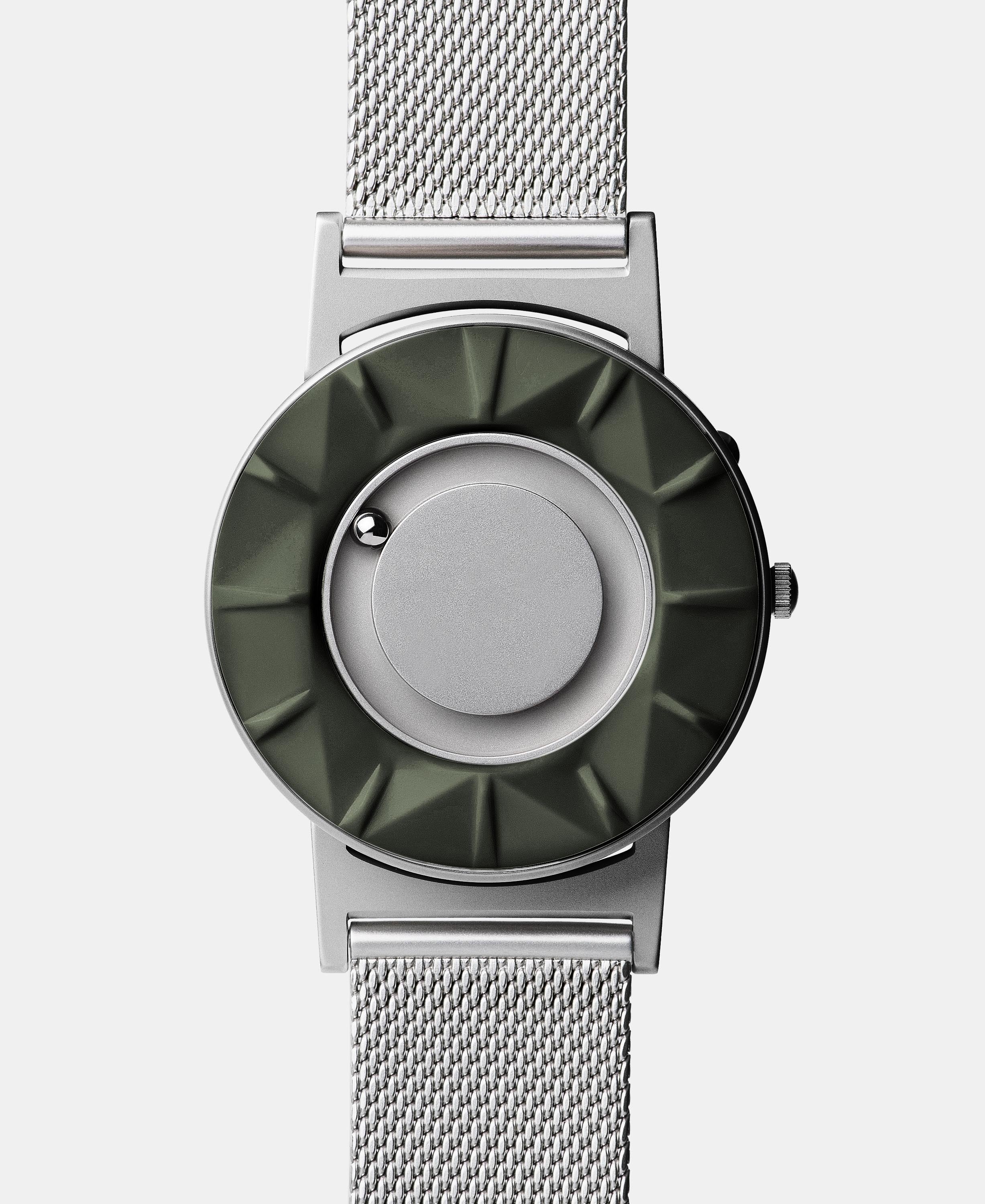 The Bradley Element Khaki features an innovative, three-dimensional surface — unlike any of the Bradley models. The topography of the watch face contours toward each marker in alternating raised and lowered impressions. This redesigned face is engineered from highly durable, scratch-resistant ceramic and is PVD coated, adding an extra level of durability. Completed by an adjustable, stainless steel mesh strap, the Bradley Element offers cutting-edge design and quality materials all in one timepiece. This timepiece is silver with a muted, khaki green face.