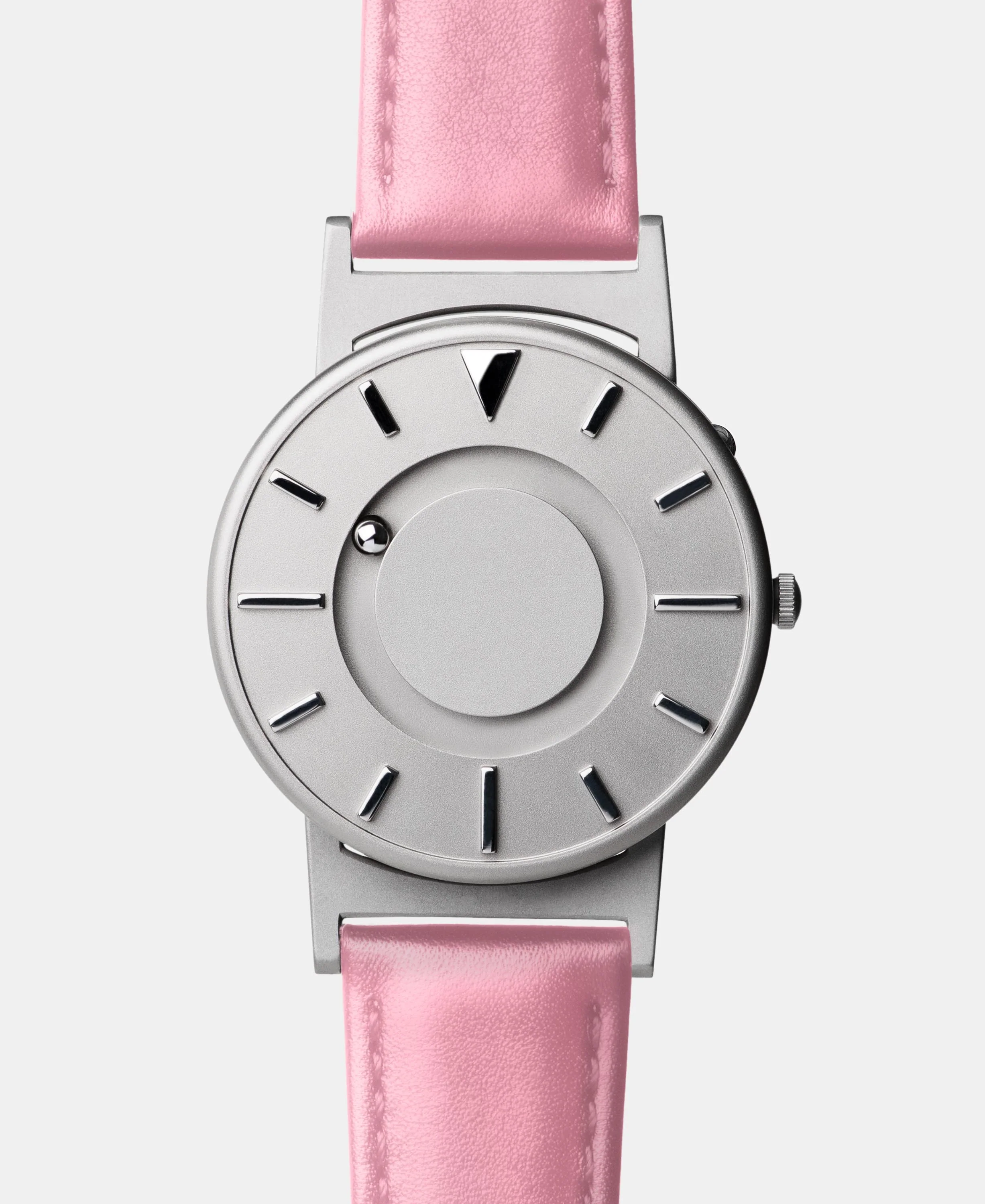 Crafted from lightweight and durable matte silver titanium, the Bradley Canvas features raised markers brushed in a smooth mirrored finish. The strap is light pink Italian leather, with matching tone stitching.