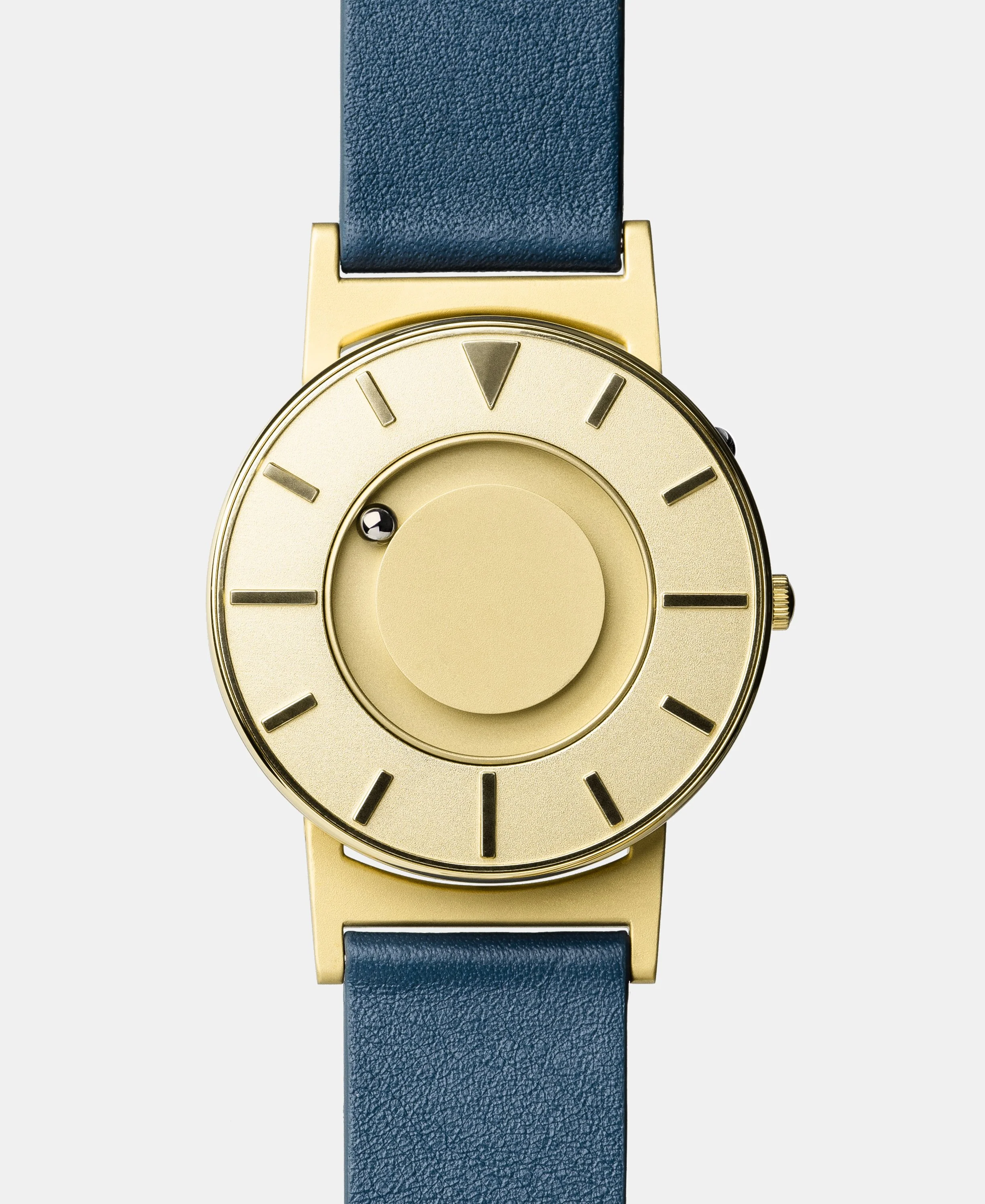 The Bradley timepiece features raised markers that allow you to feel the time by touch: a triangular marker for twelve, elongated line segments for three, six, and nine, and shorter line segments for the other markers. Two magnetized ball bearings travel around the watch face in separate, recessed tracks: one track around the center of the watch face for the minute, and one track around the outside edge of the watch face for the hour.
