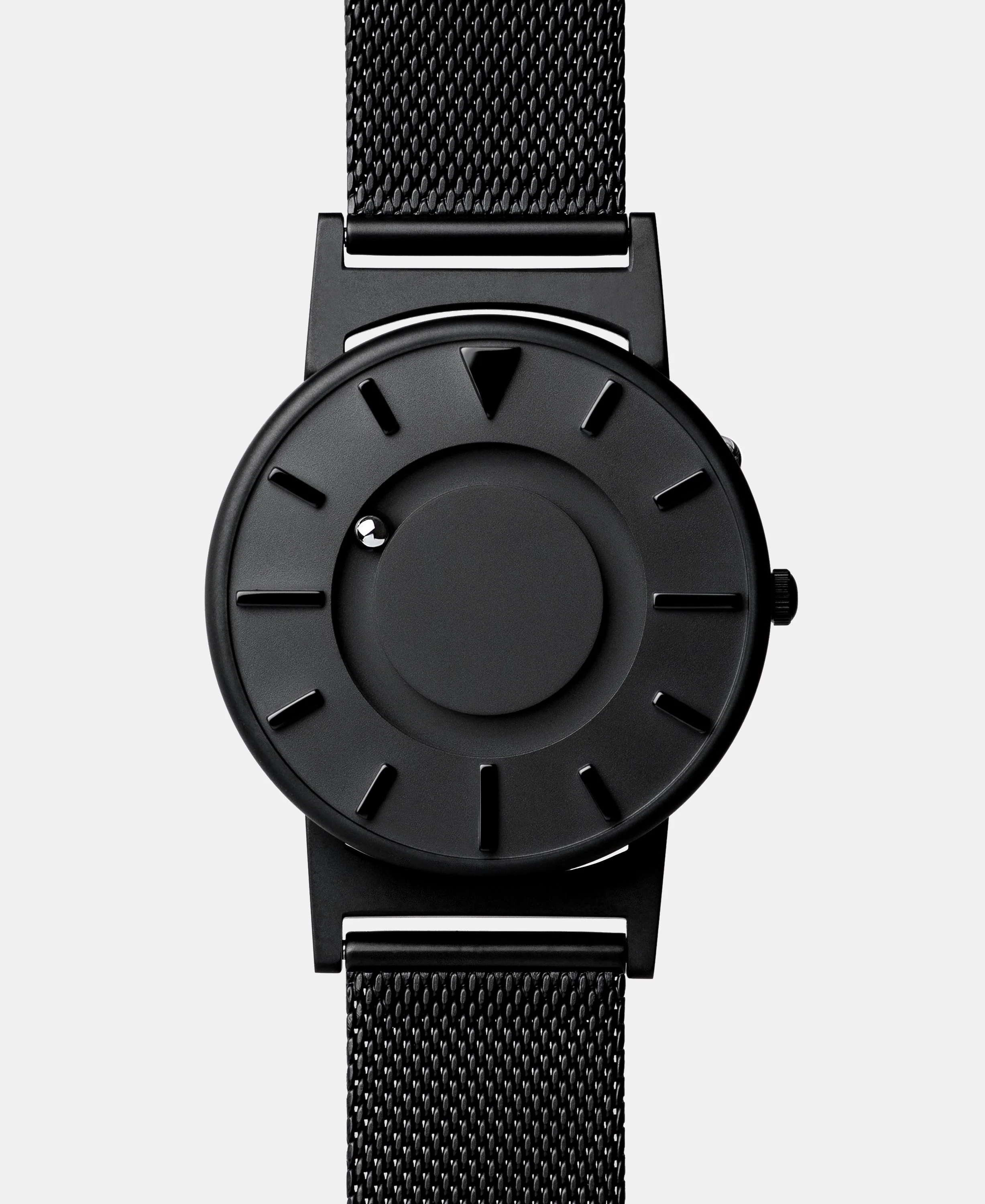 The Bradley Mesh Black features black-on-black style with matching case and strap in a matte finish. Raised markers boast a glossy polish that’s smooth to the touch and easy on the eyes.