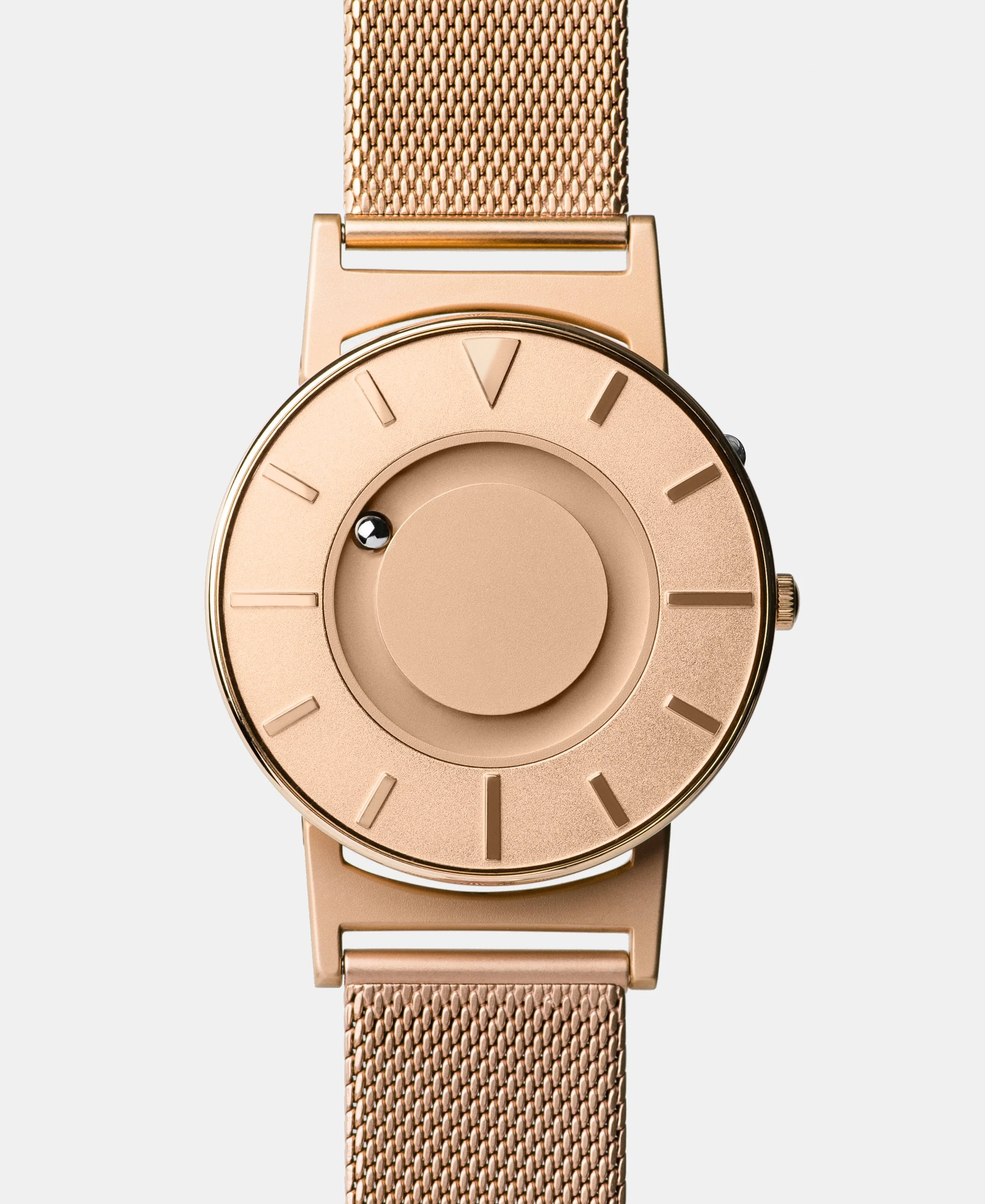 The Bradley Mesh Rose Gold II offers a subdued, warm tone softened by a matte finish. Raised markers are brushed with a rose gold hue that matches the case and strap, highlighted by a light silver face around the markers and rose gold center. A stainless steel mesh strap will keep your wrist cool as a complement to the gentle golden glow of this timepiece.