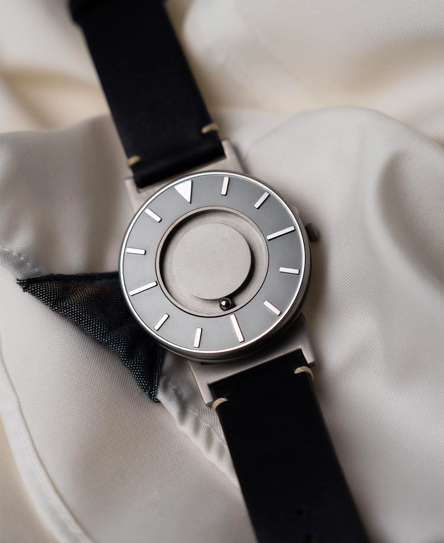 The Bradley timepiece features raised markers that allow you to feel the time by touch: a triangular marker for twelve, elongated line segments for three, six, and nine, and shorter line segments for the other markers. Two magnetized ball bearings travel around the watch face in separate, recessed tracks: one track around the center of the watch face for the minute, and one track around the outside edge of the watch face for the hour.