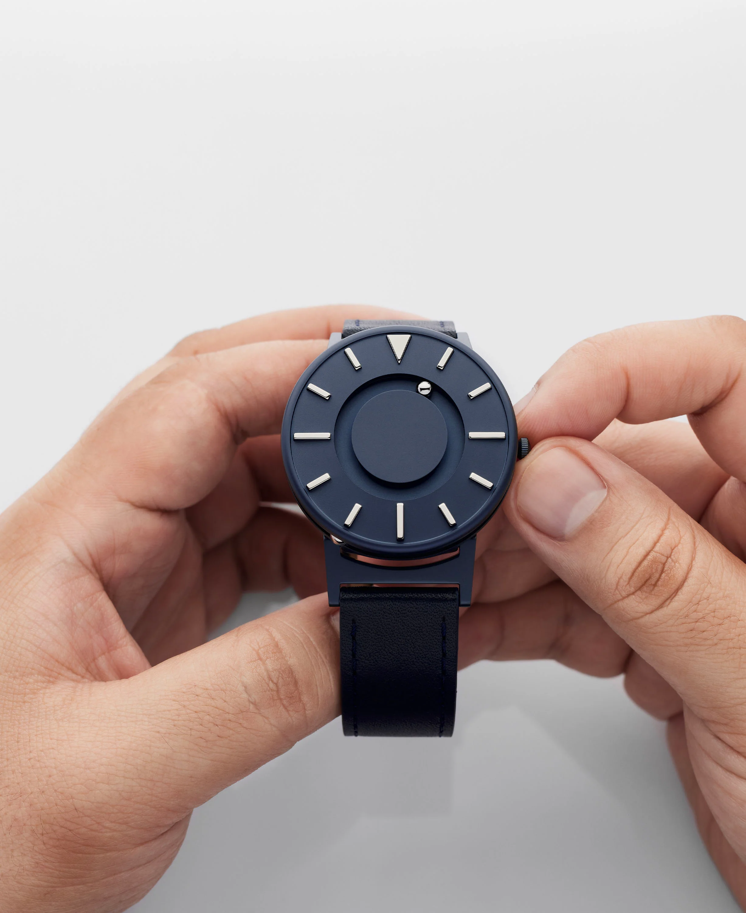 The Bradley timepiece features raised markers that allow you to feel the time by touch: a triangular marker for twelve, elongated line segments for three, six, and nine, and shorter line segments for the other markers. Two magnetized ball bearings travel around the watch face in separate, recessed tracks: one track around the center of the watch face for the minute, and one track around the outside edge of the watch face for the hour.