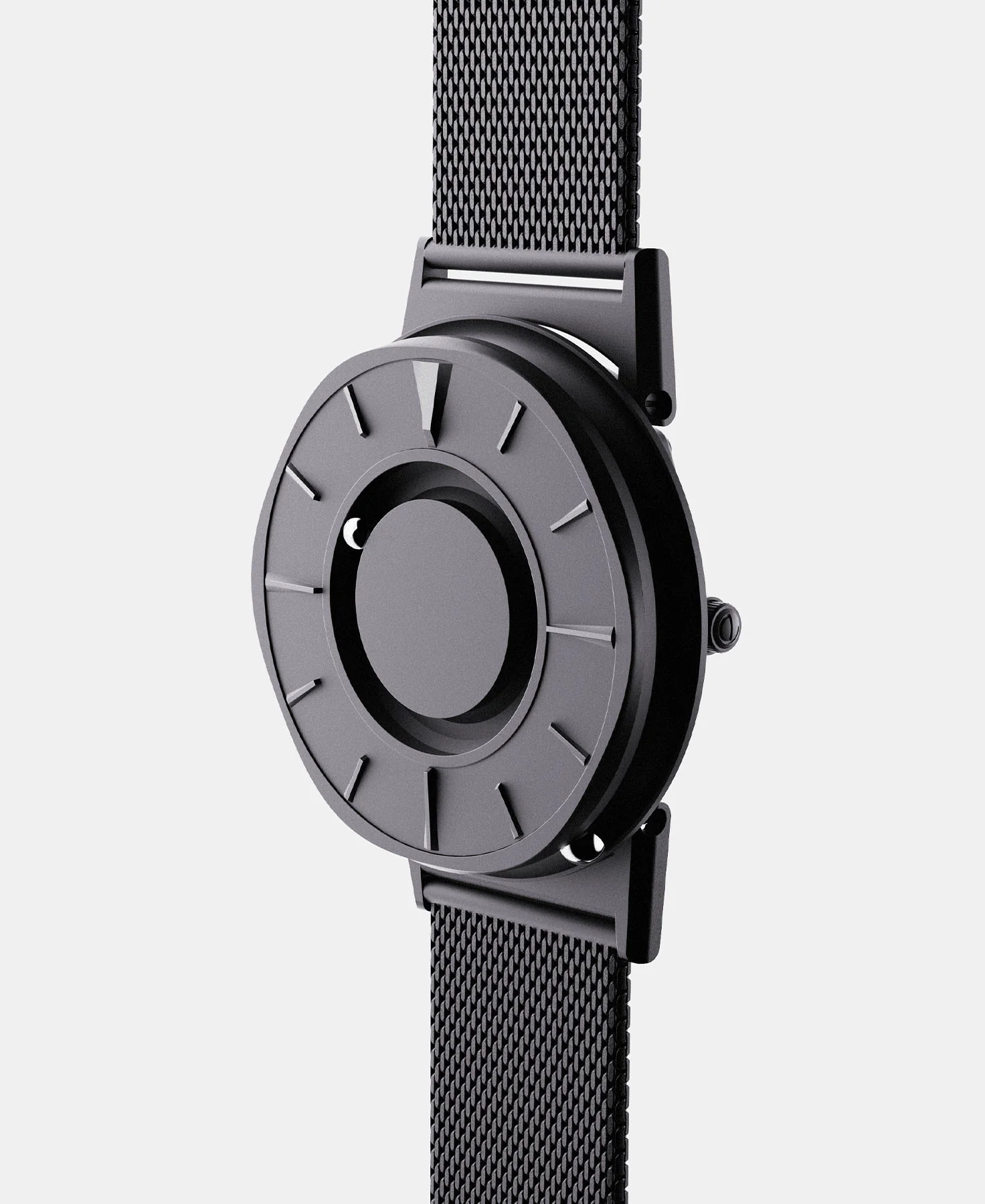 The Switch timepiece features raised hour markers that allow you to feel the time by touch: these will differ in shape on each ring however, all Switch models come with a classic 12 hour ring - a triangular marker for twelve, elongated line segments for three, six, and nine, and shorter line segments for the other markers. Two magnetized ball bearings travel around the watch face in separate, recessed tracks: one track around the center of the watch face for the minute, and one track around the outside edge of the watch face for the hour.
