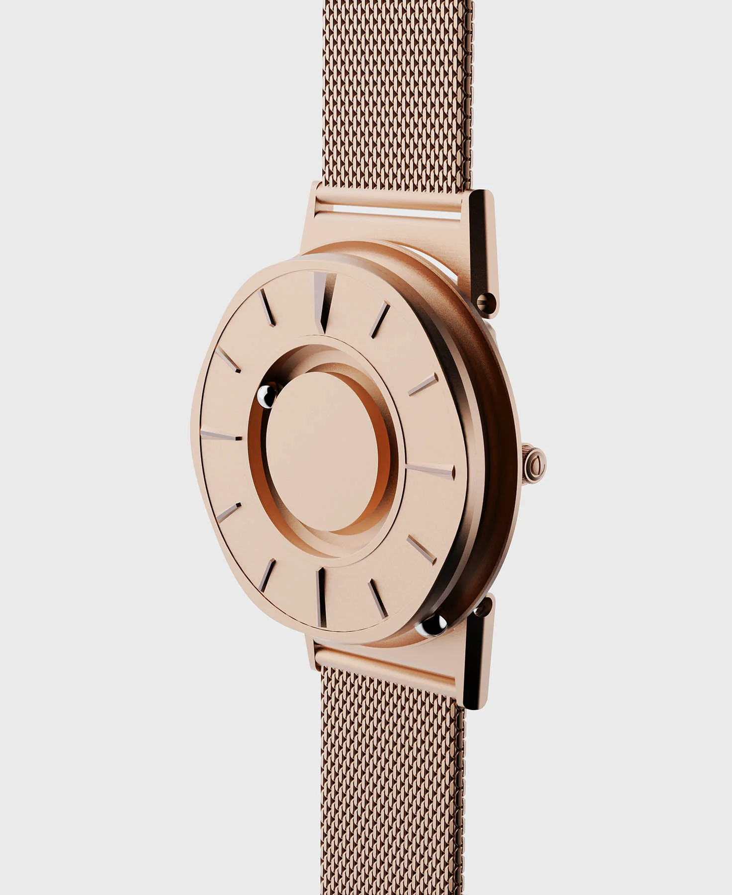 The Switch timepiece features raised hour markers that allow you to feel the time by touch: these will differ in shape on each ring however, all Switch models come with a classic 12 hour ring - a triangular marker for twelve, elongated line segments for three, six, and nine, and shorter line segments for the other markers. Two magnetized ball bearings travel around the watch face in separate, recessed tracks: one track around the center of the watch face for the minute, and one track around the outside edge of the watch face for the hour.